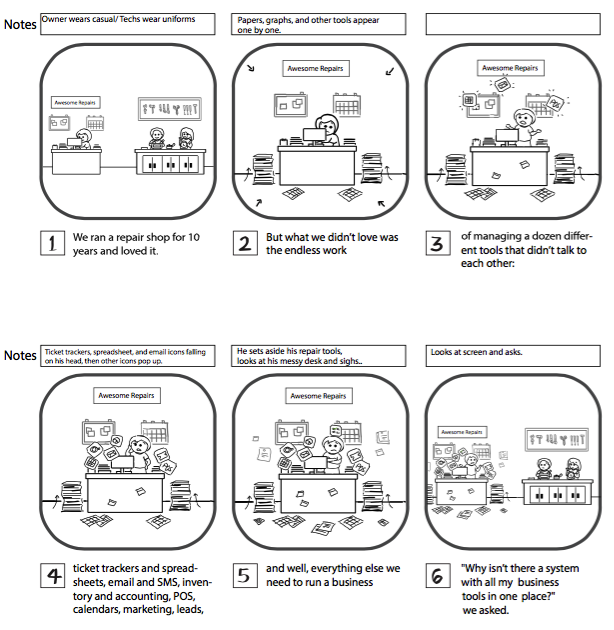 The process began by us looking at dozens of explainer videos to get a sense of what we wanted to do. We looked at other sites similar to ours and we also did a lot of searches for different kinds of product videos. At first we discussed something live action, but in the end we felt that an animated video would work best for conveying the breadth of what RepairShopr offers.