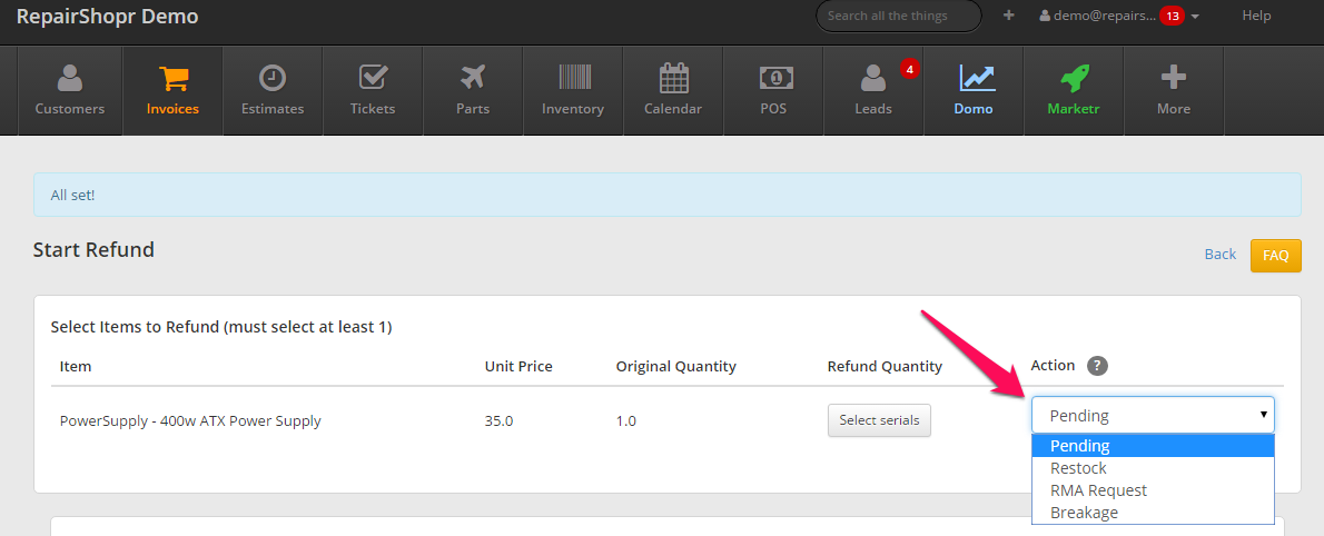 Did you receive a broken part on an order? Not a problem! You can now send that part back to the vendor and track the whole process in the new RMA Tracking Center. As you receive new information about the return from your vendor, you can easily update the status in RepairShopr so you know where the return is at all times. Once the part has been returned to you, you can complete the RMA and send the item back into your live inventory with a single click.