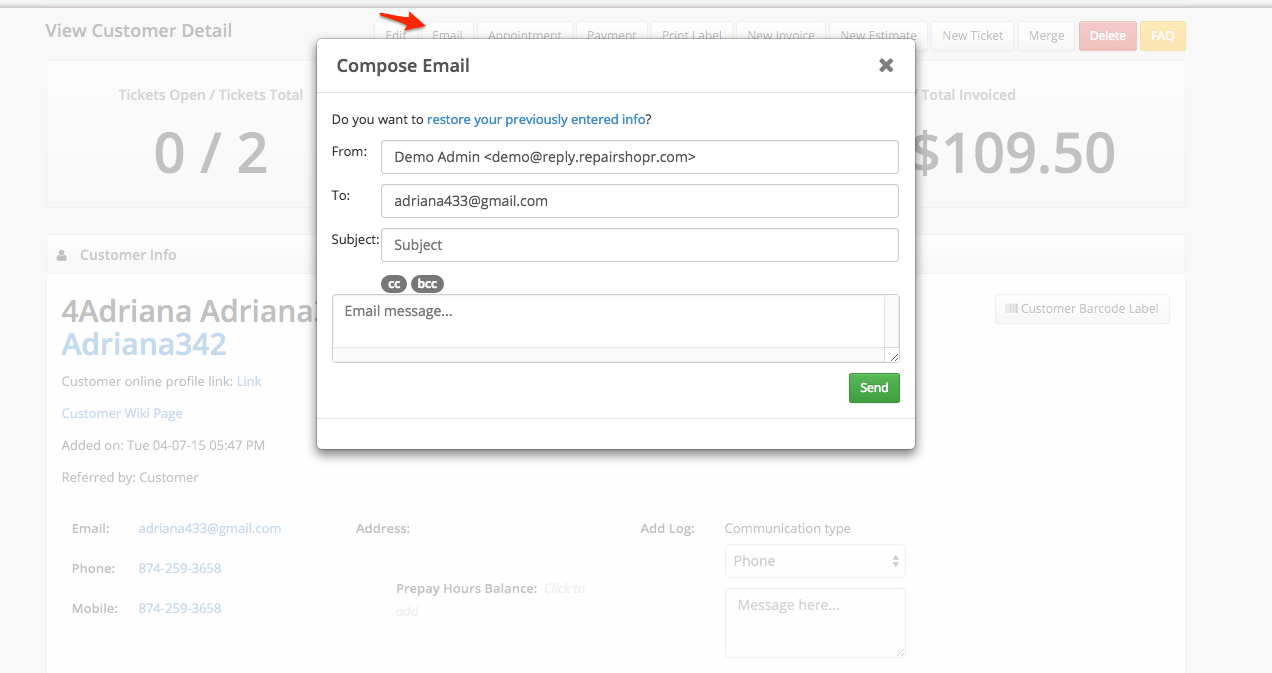 2. Added an email button to the Customer page, now you can email them (3 way email) and we’ll surface email bounces there much more prominently.