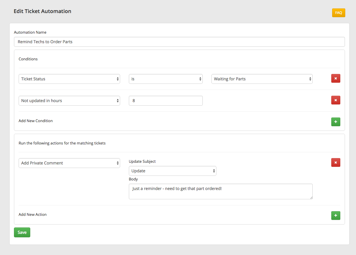 3. Ticket Automations – Automations are basically if/then statements designed to save you time. They allow you to set rules like “If a ticket in the status ‘Waiting for Customer’ hasn’t been updated in 3 days, then send an email to X and change the status.” Head to Admin – Ticket Automations to play with it.